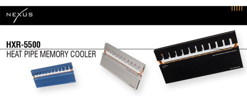 | Не иначе как революционными называет компания Nexus Technology BV свои новые алюминиевые кулеры для односторонних и двухсторонних модулей памяти типа DDR, DDR2 и DDR3, вошедшие в серию HXR-5500 и оборудованные интегрированной медной тепловой трубкой толщиной 5 мм. По заявлениям разработчиков, благодаря особой конструкции данные изделия эффективно отводят тепло от планок памяти, что в итоге позволяет уменьшить их температуру на целых 13-14 градусов по шкале Цельсия в сравнении с обычными радиаторами. При этом новинки имеют габариты 126 x 59 мм, весят 75 г и предлагаются в трёх вариантах исполнения, а именно серебристом (HXR-5500S), голубом (HXR-5500BU) и чёрном (HXR-5500BL). Что же касается вероятной стоимости вышеописанных продуктов и сроков начала их массовых продаж, то эти сведения производителем пока ещё не обнародованы. Отсебятина: Да возрадуетесь госпада оврклокеры и модингворкеры! Nexus Technology BV